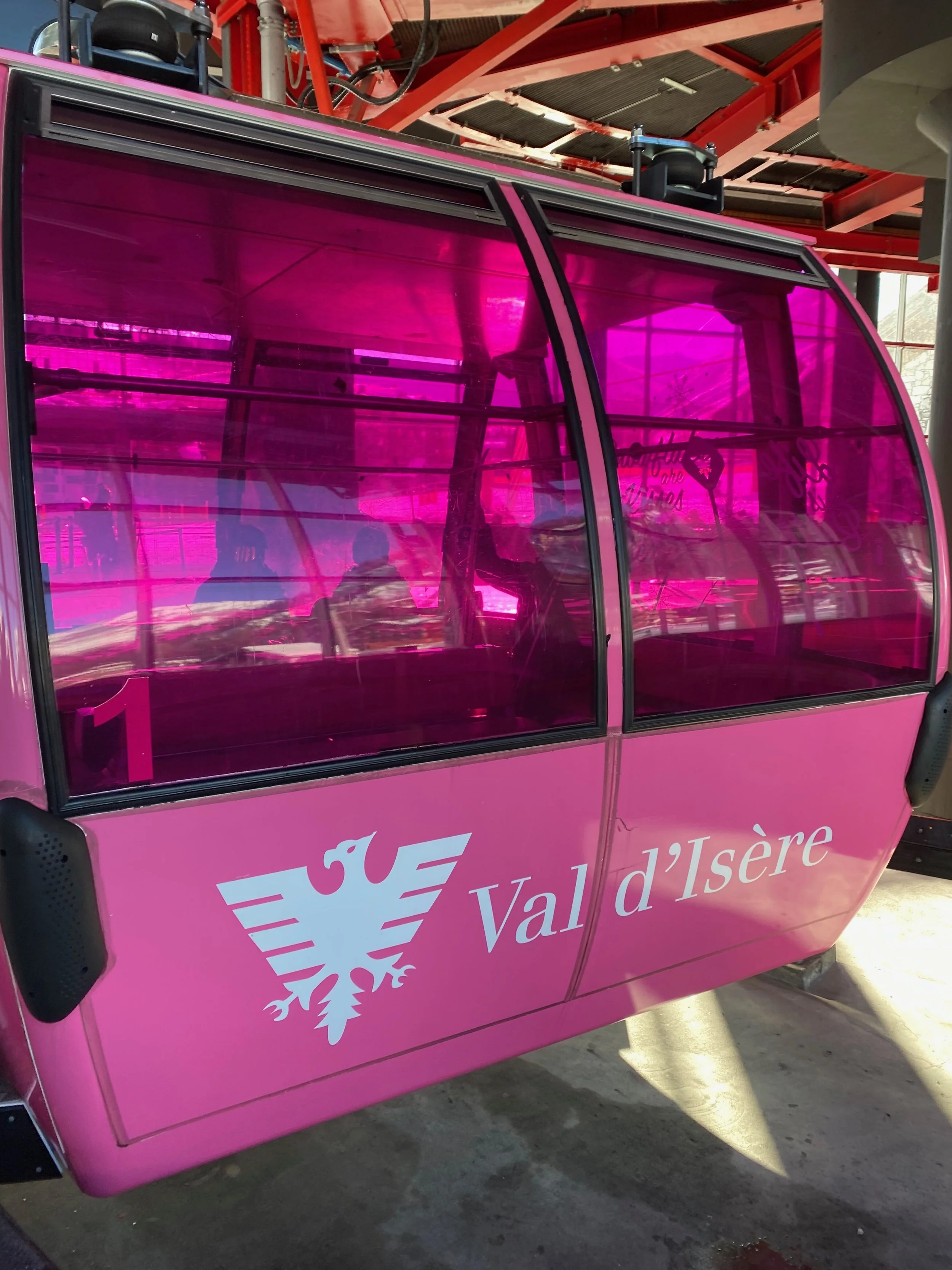 The huge cable cars of the Olympic Express departs from the left side of the Sun Bar on the snow front of Val d’Isere and travel over the infamous Face black run to the top of the Bellevarde. Travelling in this charming pink atmosphere seems to make everyone smile. The Pink Bubble comes around about once every 10 minutes and the best time to catch a ride in this charming cable car is mid-afternoon when there is no queuing time.