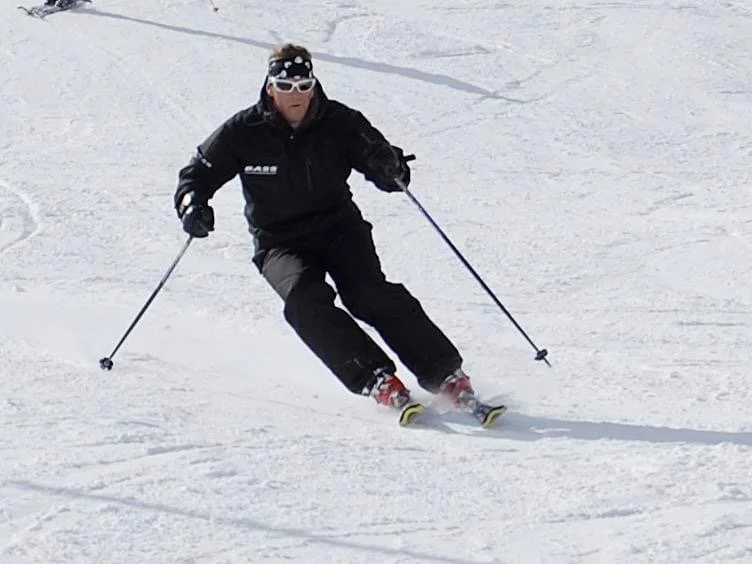 Body – Ski poles pointing down the hill on a specific marker in the distance.
