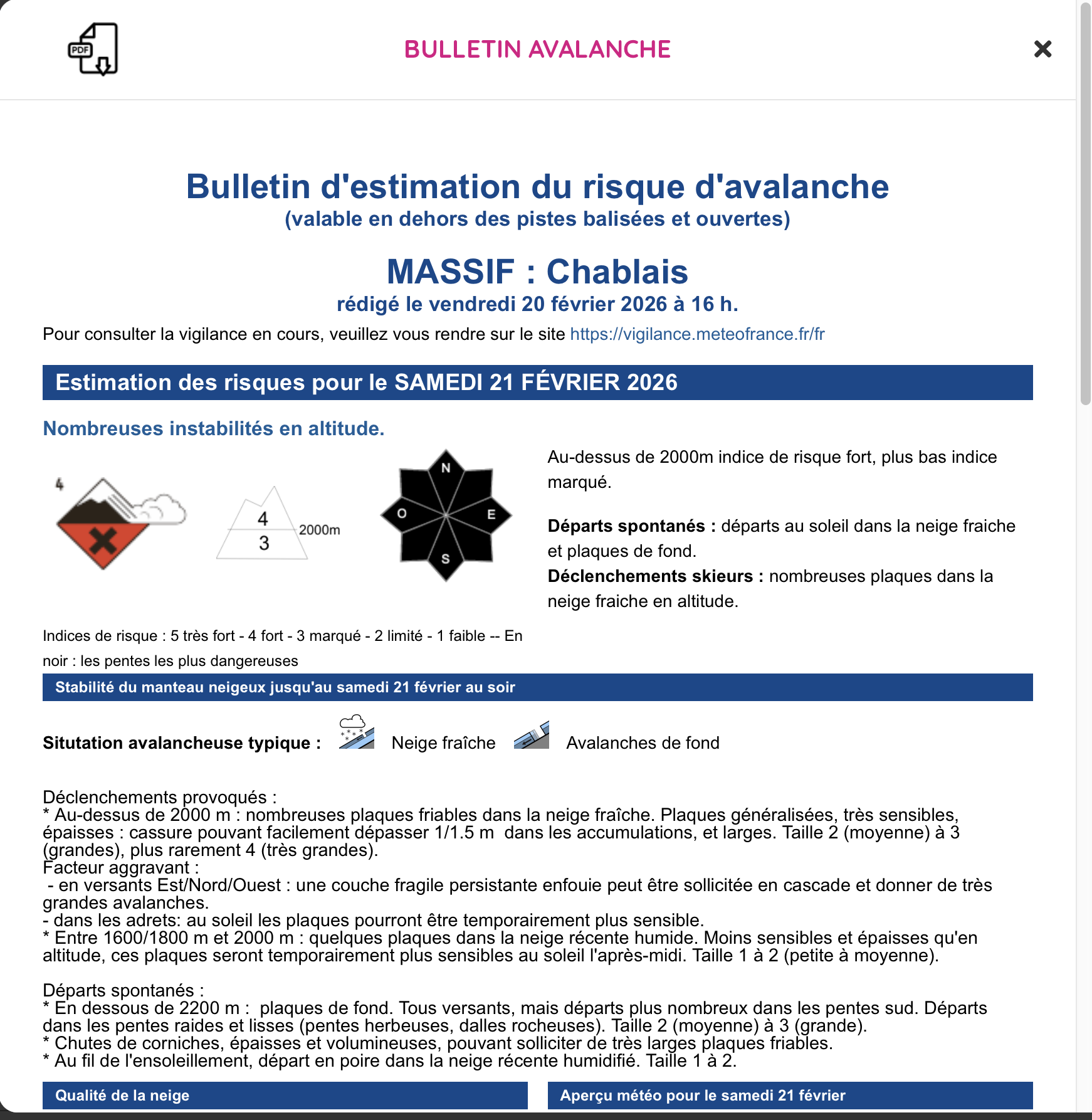 The avalanche report on the left is the official bulletin published by Meteo France and available on their excellent app Meteo ski. It shows risk values, orientation and altitude considerations, and a detailed description.