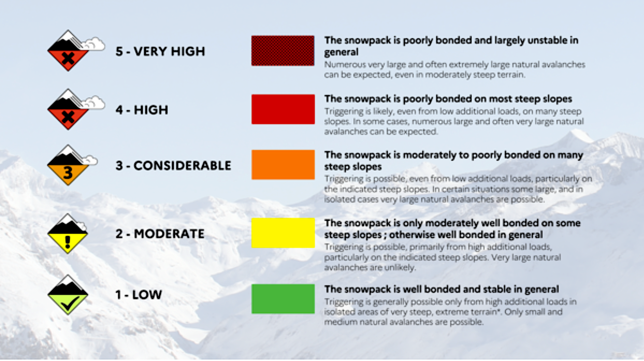 4 and 5 are so very dangerous that skiers know to stay well away from the off piste areas. In fact the situation is often so hazardous that roads and even whole resorts can be closed.