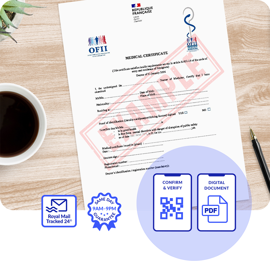 Same-day medical certificate of good health, required when applying for many international visas. France, Spain, Thailand, South Africa, South Korea, Barbados, Bermuda and worldwide. Also - Travel related medical cerificates.